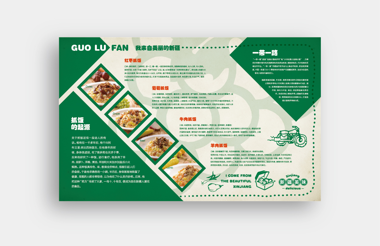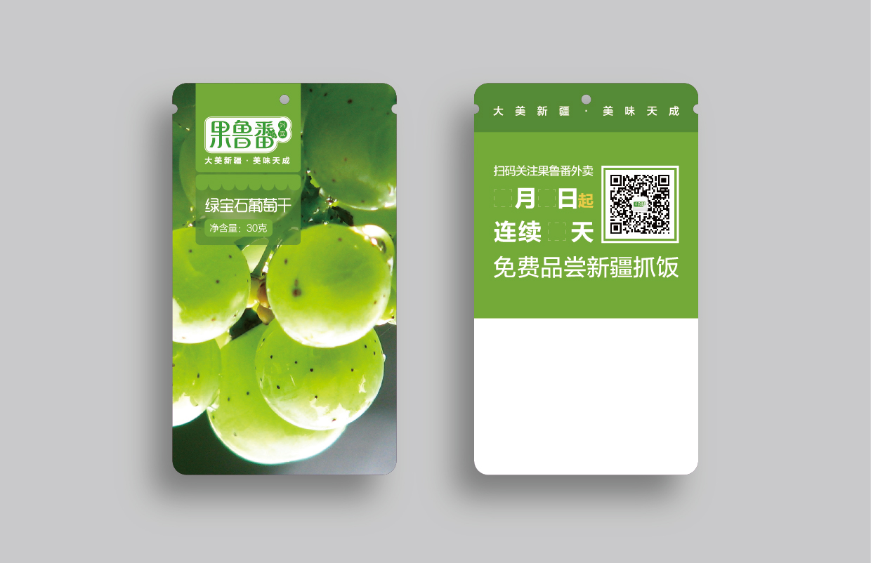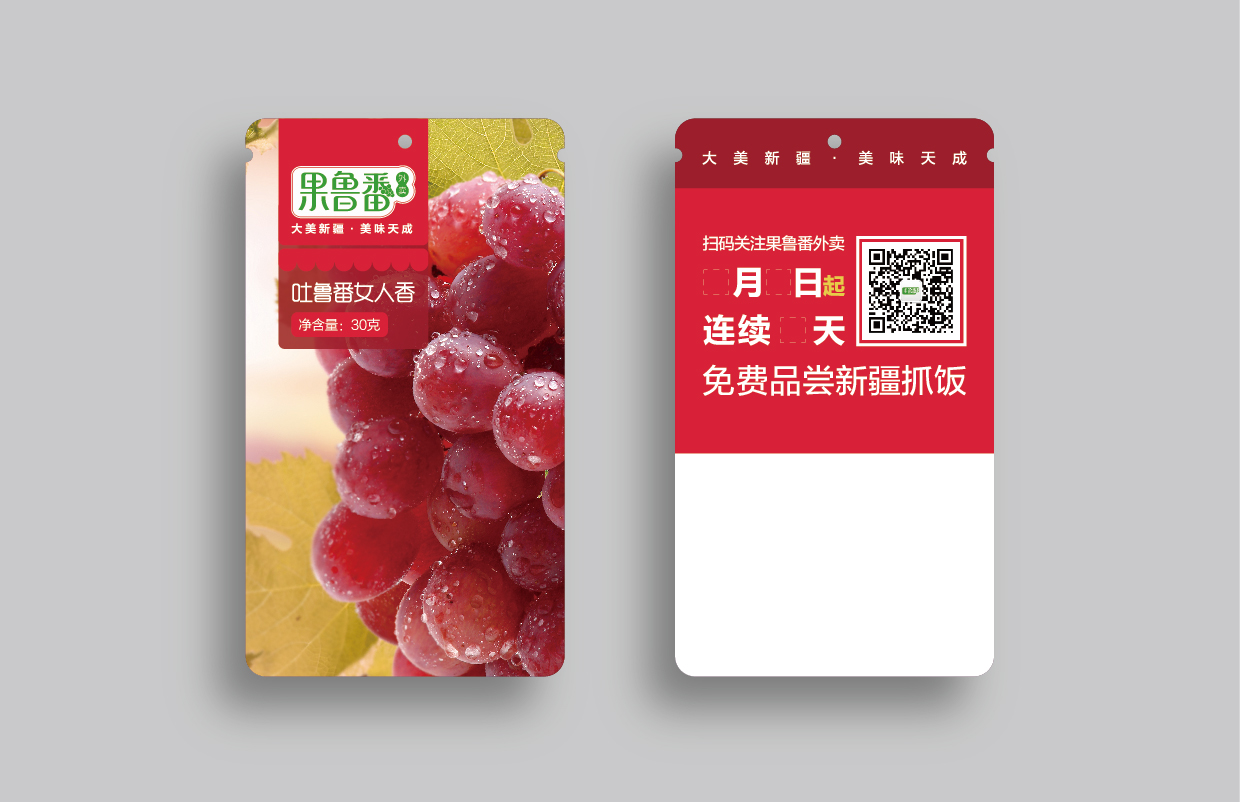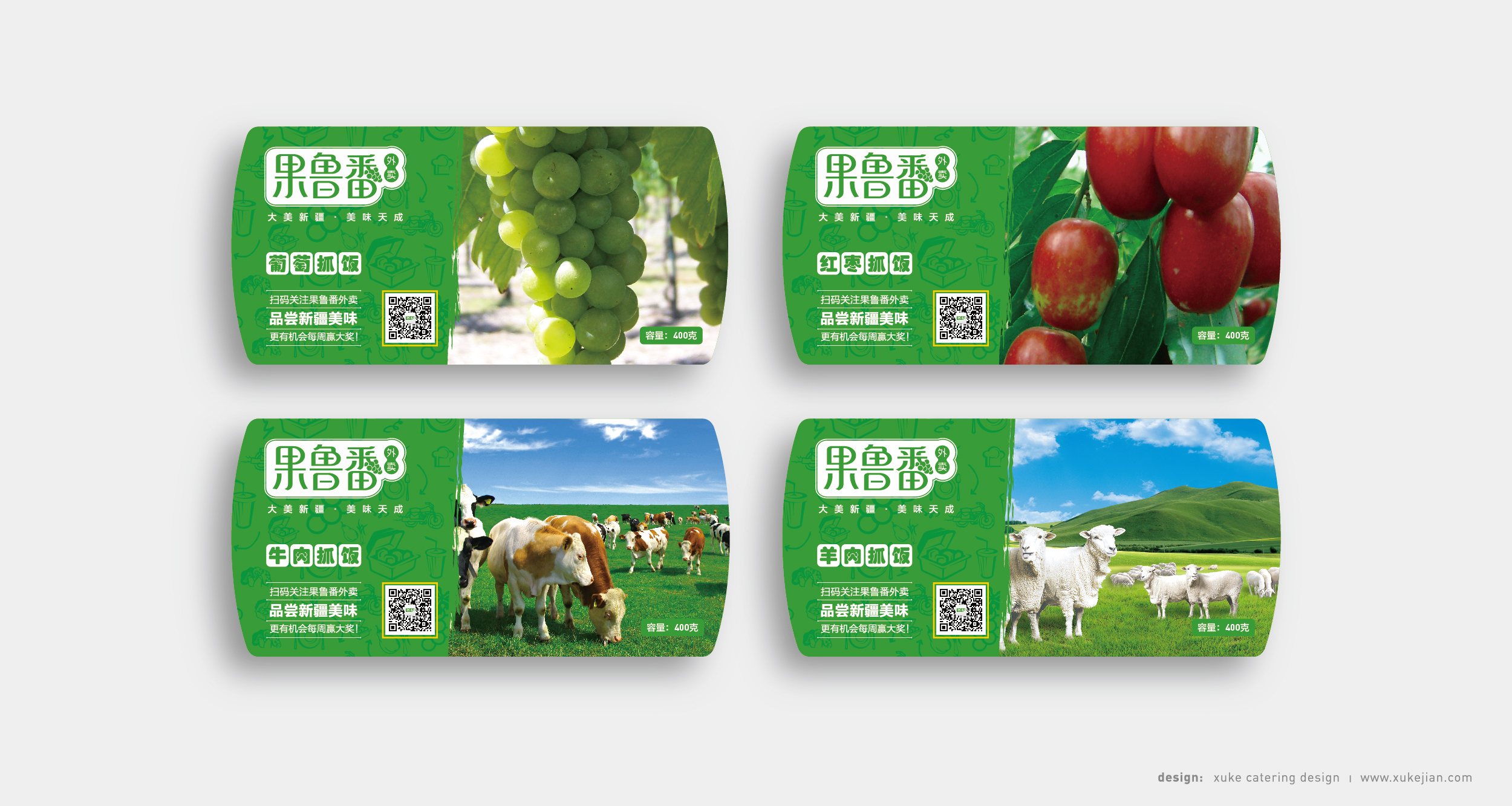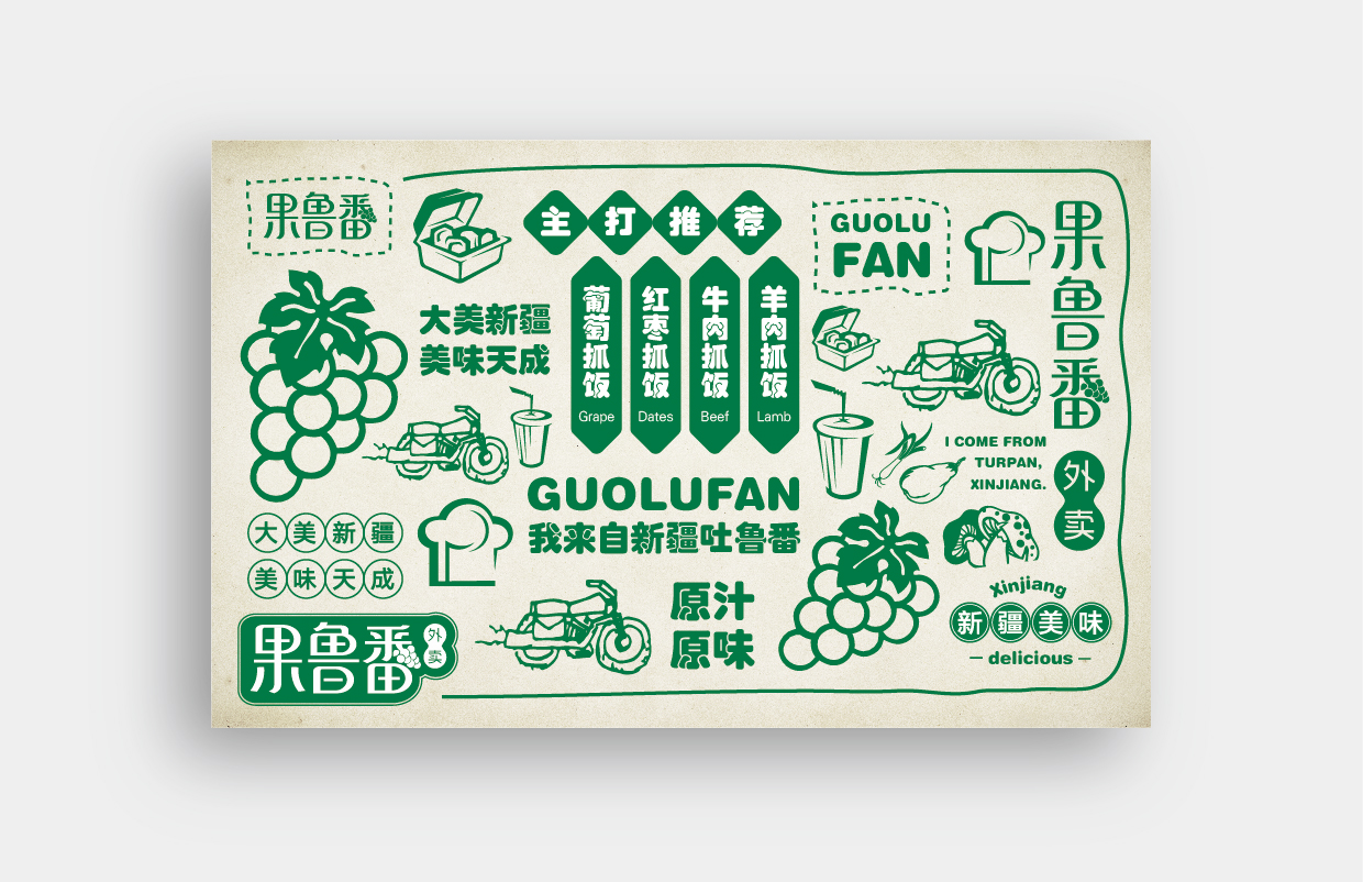果鲁番是一家主打手抓饭的新疆文化餐饮外卖品牌,餐品以干果、牛羊肉+米饭为主,甄选新疆优质水果及牛羊肉,致力于为都市中人带来天然美味的新疆feel。果鲁番的品牌色彩定位以绿色为主色调,既是泛阿拉伯颜色的其中一个颜色,又符合新疆地域特色属性,设计意象以葡萄、广阔的草原、成群的牛羊为主要设计元素,所有的品牌视觉设计均围绕“大美新疆·美味天成”的主题去打造。此外,包装所用的纸张皆采用低碳环保的可回收、可循环再用纸张为印刷介质,所有顾客能够看得见、接触得到的地方和东西都紧紧围绕主题进行策划和设计。