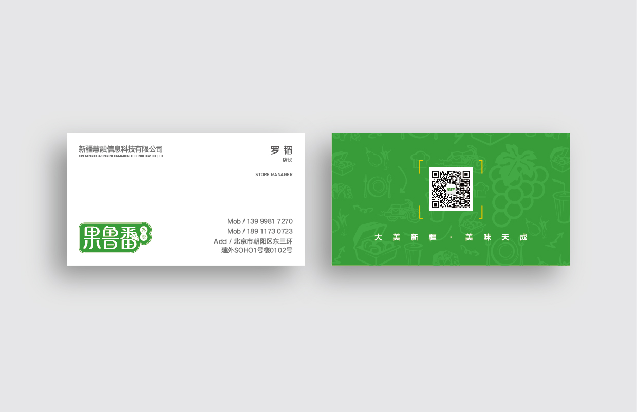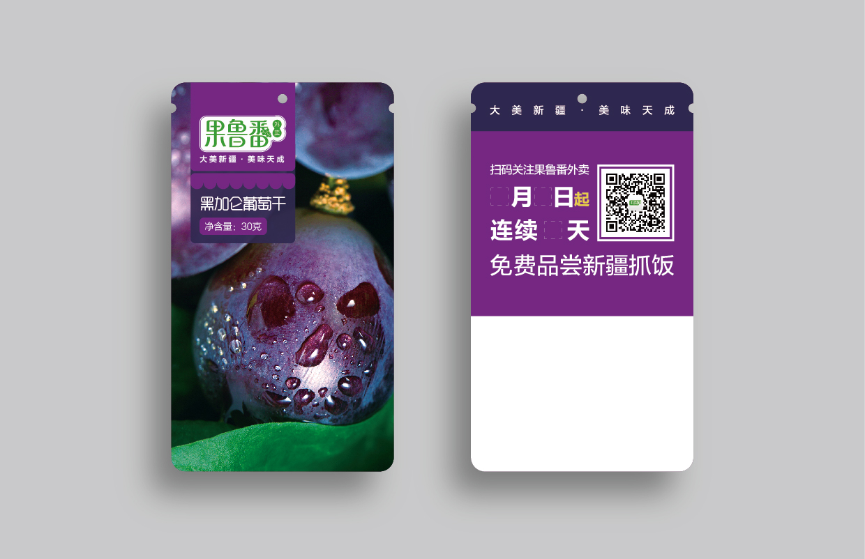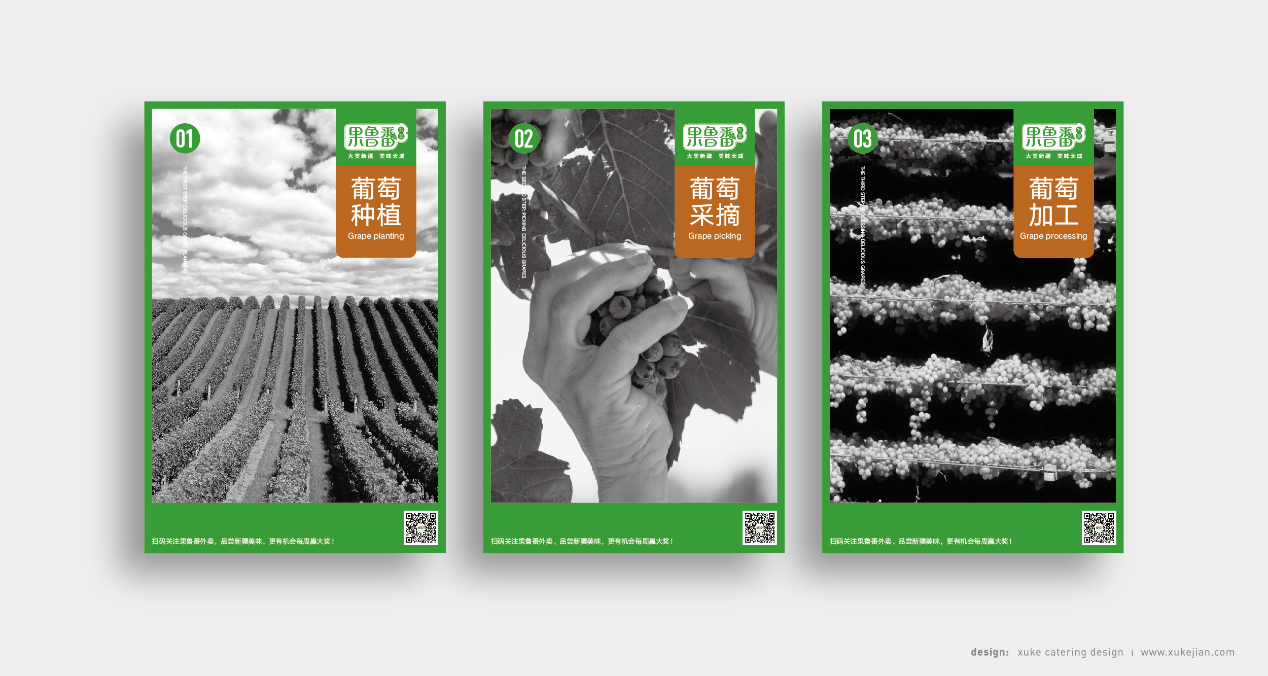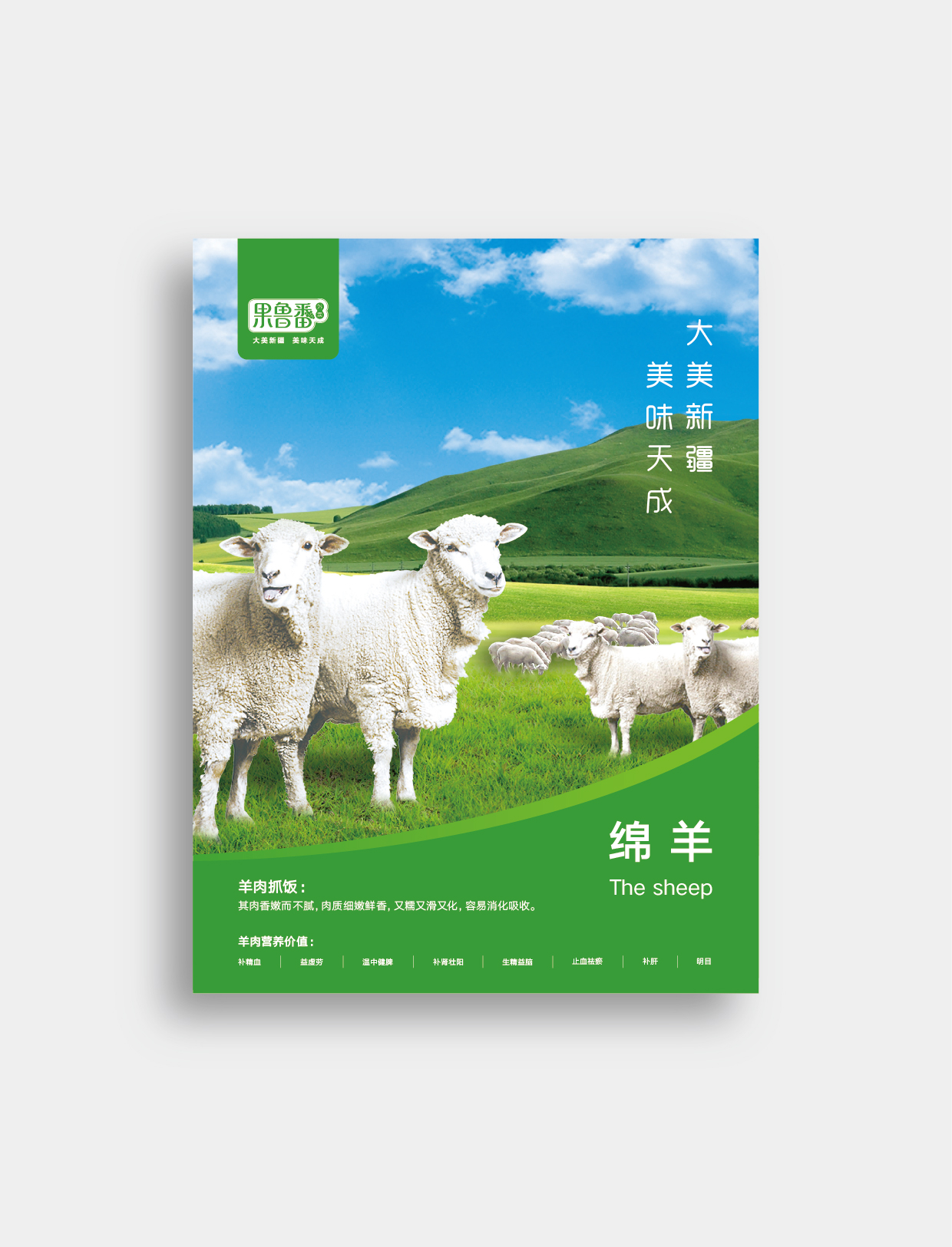 果鲁番是一家主打手抓饭的新疆文化餐饮外卖品牌,餐品以干果、牛羊肉+米饭为主,甄选新疆优质水果及牛羊肉,致力于为都市中人带来天然美味的新疆feel。果鲁番的品牌色彩定位以绿色为主色调,既是泛阿拉伯颜色的其中一个颜色,又符合新疆地域特色属性,设计意象以葡萄、广阔的草原、成群的牛羊为主要设计元素,所有的品牌视觉设计均围绕“大美新疆·美味天成”的主题去打造。此外,包装所用的纸张皆采用低碳环保的可回收、可循环再用纸张为印刷介质,所有顾客能够看得见、接触得到的地方和东西都紧紧围绕主题进行策划和设计。
