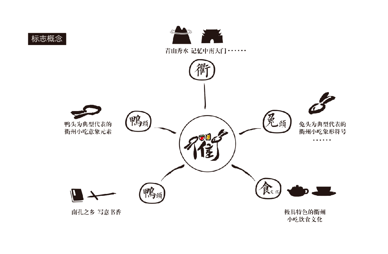 作为衢州市政府力推向全国各地的衢州小吃,品牌标志的设计在衢州悠久的历史文化和饮食文化特色为大背景下,设计创作上以写意的“衢”字为原型,大形上表以挥洒自如的书法,诠释衢州小吃品牌文化的深厚积淀。象形上,精巧同构式地融合了在衢州地区具有代表性和经典口碑的鸭头和兔头为元素,呈现独具特色的小吃文化意象,标志左右格局中的双“目”字则自然地浓缩成印象化的餐盘碗筷,颜色上则以尖椒“红”,葱花“绿”和鸭蛋“黄”作为点缀记忆点,味觉与视觉上的统一与协奏,自然而然中,发散出“味在衢字中”、“味在其中”、“味中有味”的文化韵味。刚柔并进的线条挥洒出对品牌未来发展的美好期冀!