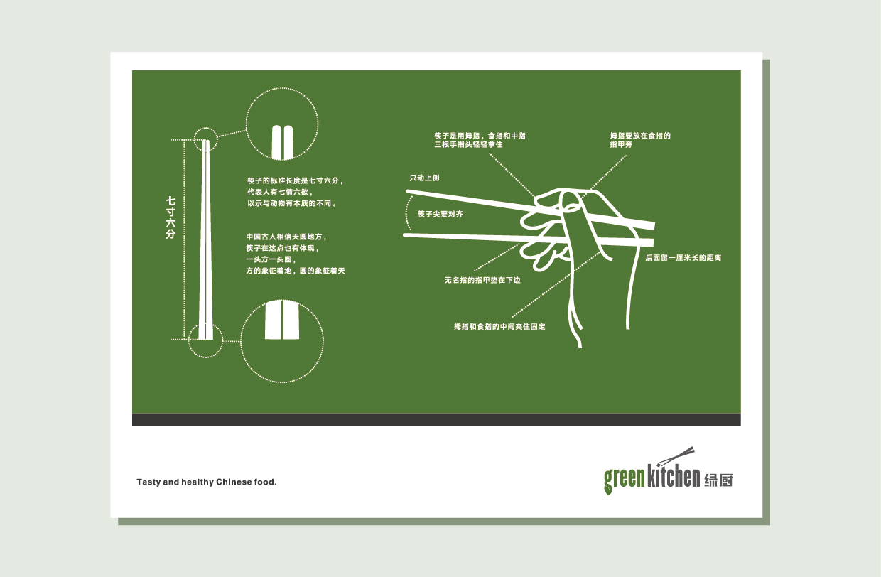 在品牌的实际运用中,为了形成标志性的形象,许可餐饮设计顾问将象征中式餐饮特色的“筷子”与象征健康绿色的字母“g”进行了重新组合,并将之运用在打包纸袋、餐具、筷套、名片、餐垫纸等各个细节处,以加深消费者对于品牌的记忆,塑造品牌专属的“超级符号”。