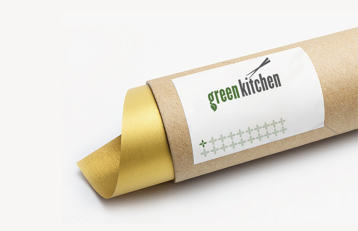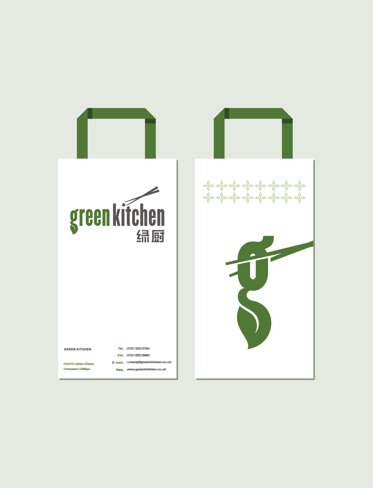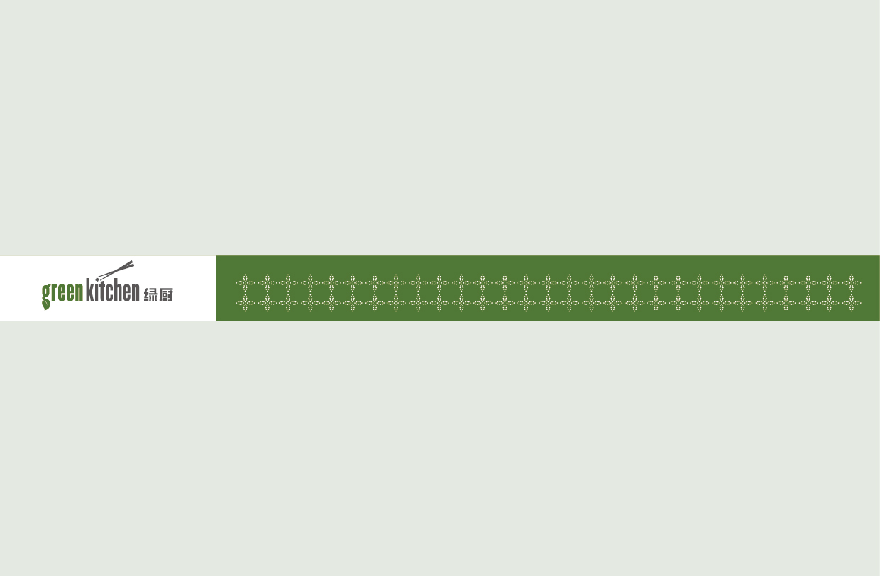 根据greenkitchen的品牌定位和理念,许可餐饮设计顾问选取绿色为主色调,搭配灰色使整体视觉效果更加协调。在LOGO设计中,将首字母“g”与“叶子”进行有机结合,以传达绿色、生态属性;同时将字母“i”的一点进行物化,与上方的筷子进行结合,传达出中式餐饮的特色属性。接着通过对字母的比例进行调整,使得整组字体的重心抬高,使整体比例不会显得过分狭长。